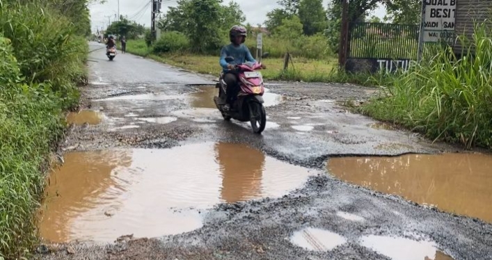 Pengendara yang melintas harus berhati-hati lantaran jalan tersebut banyak terdapat lubang dengan ukuran besar.