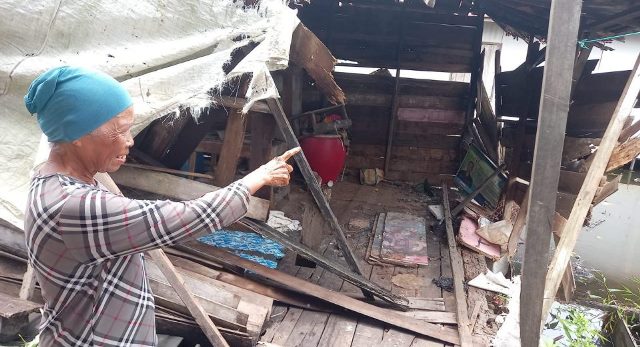 Normah (70) warga setempat terlihat cukup sabar saat memandang bagian dapur rumahnya yang ambruk, dan saat menerima bantuan logistik.