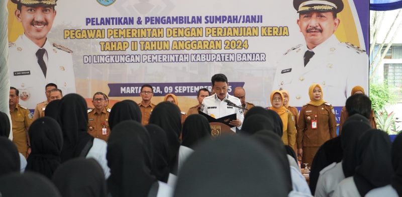 Katajari.com – Bupati Banjar H Saidi Mansyur resmi melantik dan mengambil sumpah jabatan 369 Pegawai Pemerintah dengan Perjanjian Kerja (PPPK) di lingkungan Pemerintah Kabupaten Banjar, Selasa (9/9/2025) pagi di halaman belakang Kantor Bupati Banjar, Martapura.