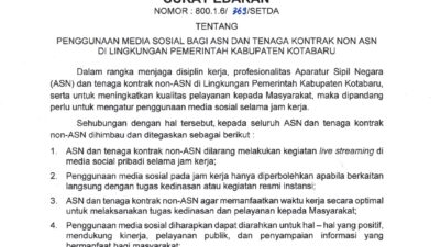 Katajari.com – Pemerintah Kabupaten Kotabaru resmi mengeluarkan Surat Edaran Nomor 800.1.6/369/SETDA tentang penggunaan media sosial bagi Aparatur Sipil Negara (ASN) dan tenaga kontrak non-ASN di lingkungan Pemerintah Kabupaten Kotabaru.