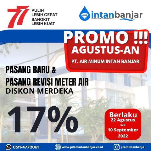 Katajari.com – Kesempatan bagi warga Kabupaten Banjar dan Kota Banjarbaru yang belum memiliki aliran air leding dari PT Air Minum Intan Banjar, karena terkait HUT ke 77 Kemerdekaan RI, PT Air Minum Intan Banjar memberikan paket khusus untuk pelanggan baru melakukan pemasangan sambungan rumah alias SR, juga bagi pelanggan lama dalam pemasangan revisi meter air.