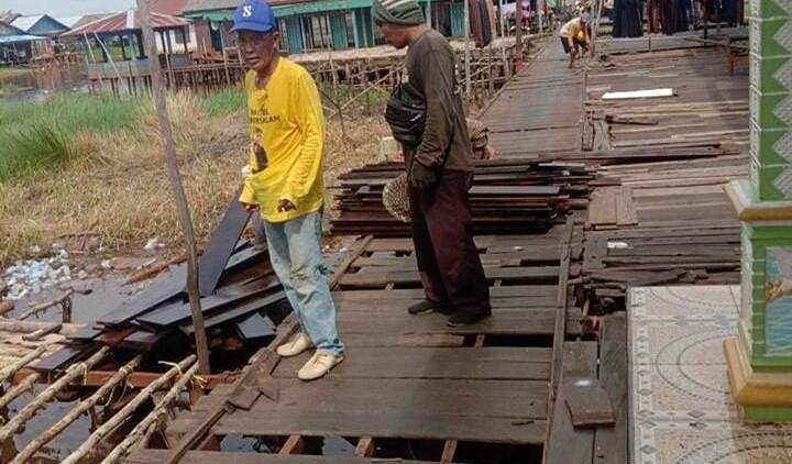 Katajari.com – Gerakan Pemuda Ansor dan Banser Desa Alalak Padang Kecamatan Cintapuri Darussalam kembali menunjukkan kepedulian sosialnya melalui kegiatan tambal sulam titian kayu yang menjadi akses utama warga, Senin (14/7/2025).