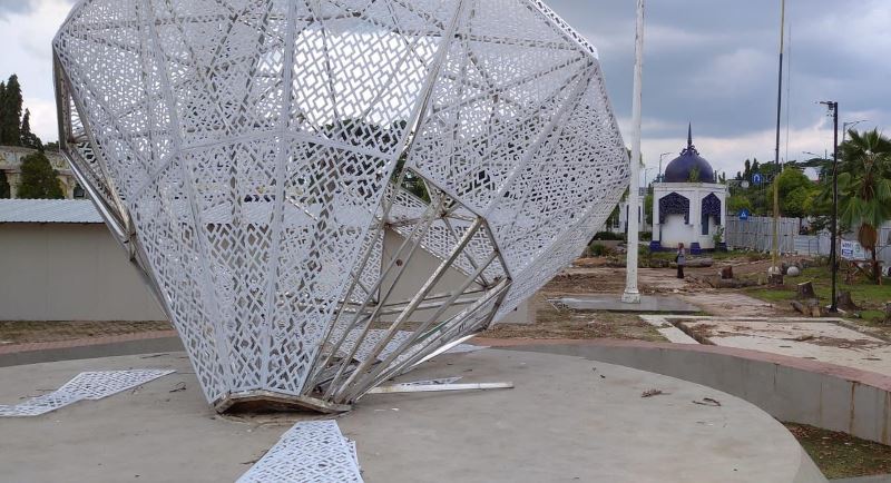 Kerusakan itu lantaran pohon yang ditebang menimpa icon Taman Pojok Manis, padahal baru beberapa bulan selesai dikerjakan.