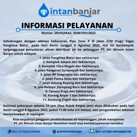 Humas PTAM Intan Banjar telah menyampaikan informasi penghentian sementara pengaliran distribusi air, dan pekerjaan perbaikan kebocoran.
