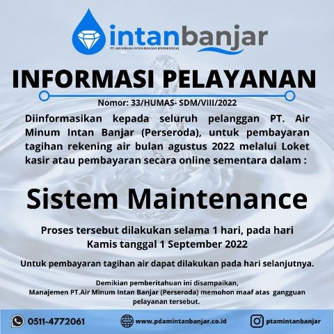 Disebutkan pihak PT Air Minum Intan Banjar melakukan perbaikan selama sehari, yakni Kamis 1 September 2022 sehingga layanan transaksi pembayaran tagihan air via online dan kasir tidak bisa beroperasi pada hari itu.