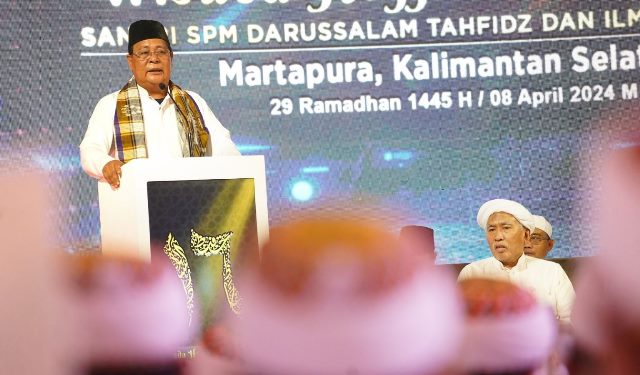 “Malam ini Paman Birin menghadiahi umrah bagi Huffadz,” ucap Paman Birin saat memberikan sambutan pada Wisuda Huffadz Al-Qur’an Angkatan XVI Tahun 1445 H / 2024 Santri Madrasah Tahfidzul Qur’an Darussalam Tanjung Rema, Martapura, Senin (8/4/2024).