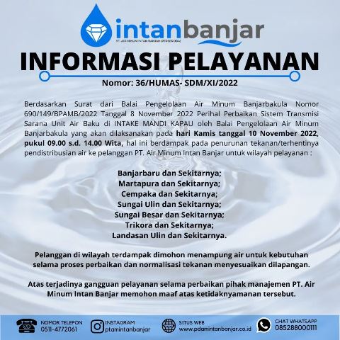 PT Air Minum Intan Banjar menyampaikan pemberitahuan kepada pelanggan Kamis (10/11/2022) ini pendistribusian air terganggu selama lima jam dari 09.00 sampai 14.00 Wita karena adanya perbaikan Intake Mandi Kapau yang dilakukan BPAM Banjarbakula.