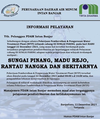 “Kami meminta maaf atas gangguan pelayanan pendistribusian, dan dimohonkan pelanggan menyediakan penampungan air sementara untuk kebutuhan rumah tangga,” sebagaiman tersirat dalam isi pengumuman PDAM Intan Banjar.