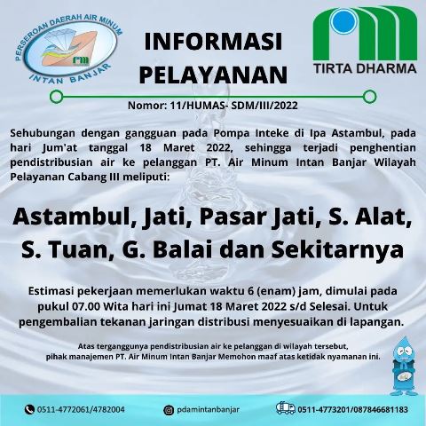 Gangguan pendistribusian ini sudah disampaikan atau diumumkan Humas PT Air Minum Intan tertulis dalam layanan informasi Nomor 11/Humas-SDM/III/2022.