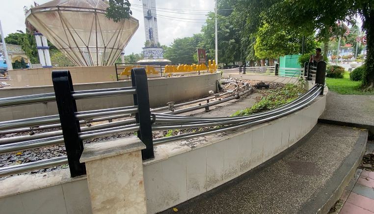 Bukan hanya itu, besi pagar dari bangunan Air Mancur Intan tersebut juga ada sebagian yang copot, hal ini memperparah kondisi Air Mancur yang sudah tidak dioperasikan sejak pandemi covid-19 lalu.