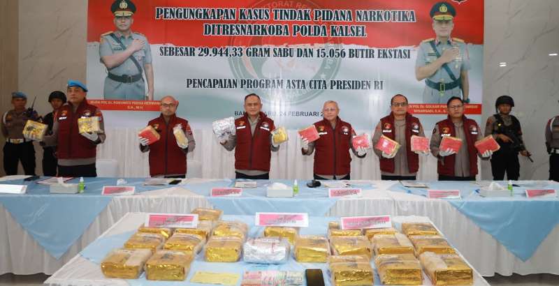 Katajari.com – Sabu seberat 29.944,33 gram (29,9 Kg) dan 15.056 butir pil ekstasi dengan berat bersih 5.767,47 gram berhasil digagalkan Direktorat Reserse Narkoba (Ditresnarkoba) Polda Kalimantan Selatan beredar di banua .