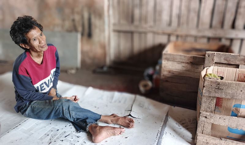 Mirisnya, kondisi Zulkarnain tampaknya dalam kondisi lumpuh atau tidak mampu berjalan, sehingga semua aktivitas yang dia lakukan tidak seperti warga normal lainnya.