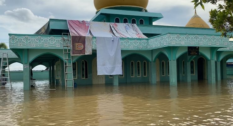 Selain merendam akses dan rumah-rumah warga, banjir juga rendam masjid di desa tersebut.