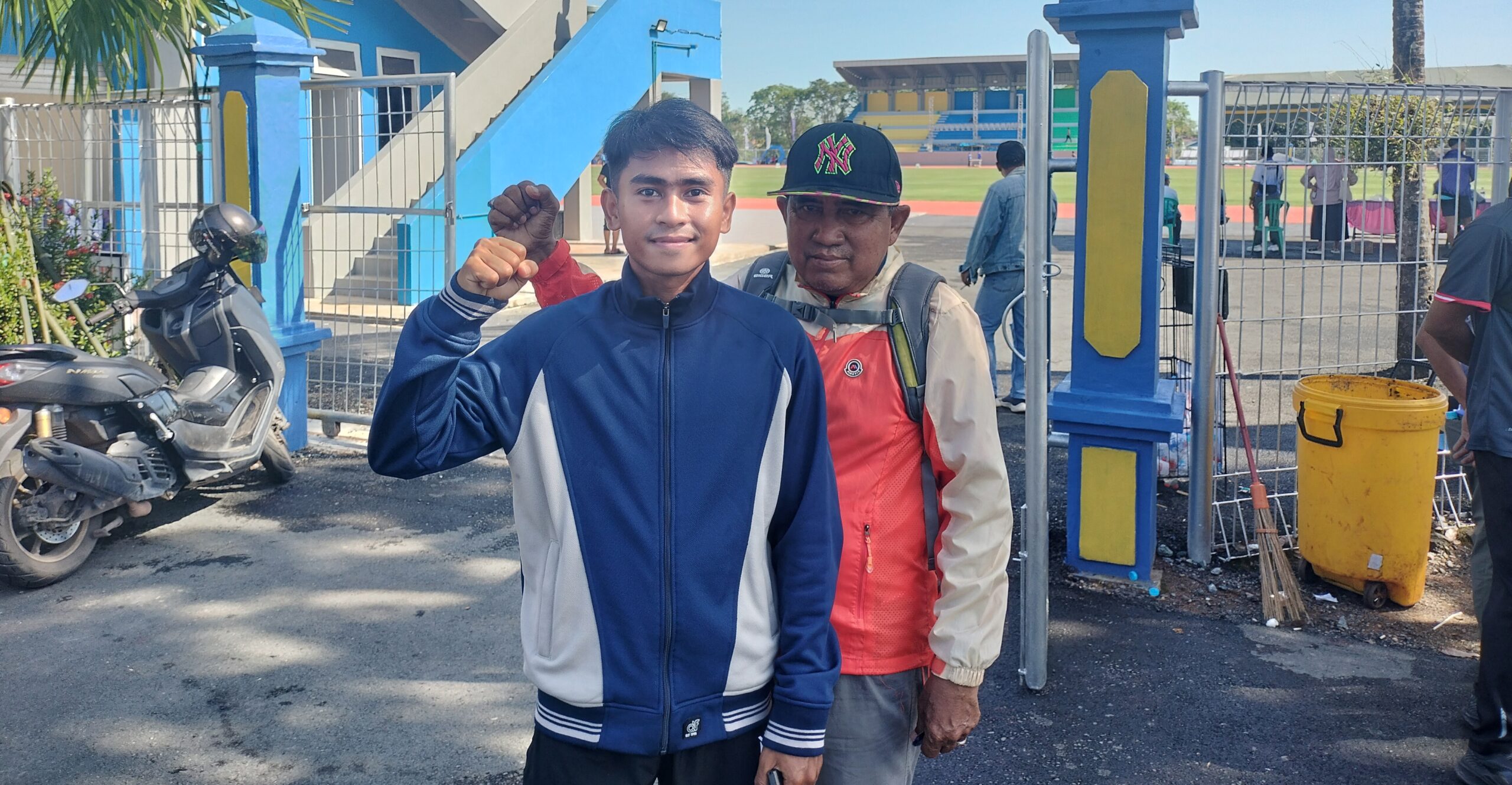 Atlet atletik Kabupaten Banjar Doni Rahman dengan medali emas nomor 21 Km, Senin (3/11/2025) pagi di Stadion Pertasi Kencana Pelaihari. (Foto: katajari.com)