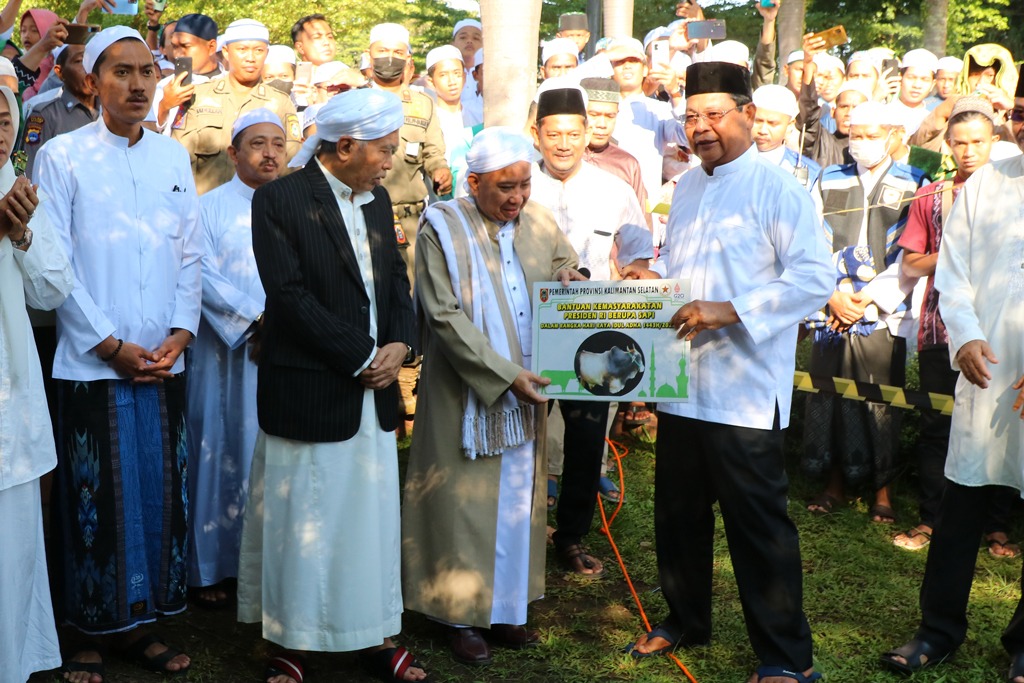 Bantuan sapi kurban diserahkan langsung oleh Gubernur Kalsel, Sahbirin Noor, kepada Ketua Tanzir Masjid Agung Al-Karomah, KH Hasanuddin Badaruddin.
