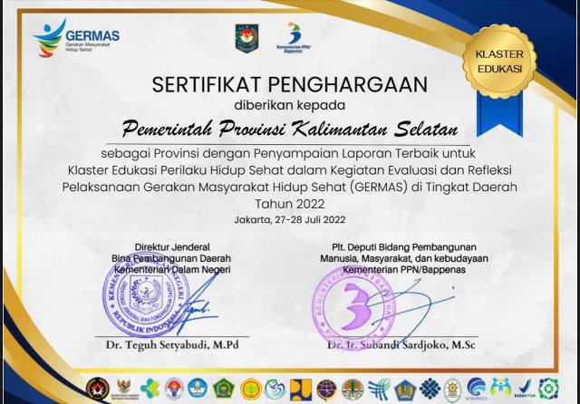 Kemudian di tahun 2021, Kalsel kembali mendapatkan penghargaan dari Kementerian Kesehatan yaitu penghargaan inovasi terbaik dalam implementasi pembudayaan germas dalam pencegahan stunting.