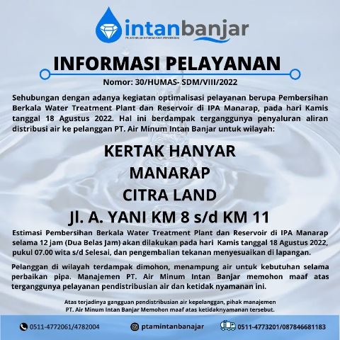 Humas PT Air Minum Intan Banjar mengingatkan kepada pelanggan di wilayah terdampak, dimohonkan dapat menampung air untuk kebutuhan selama pembersihan WTP dan Reservoir berlangsung.