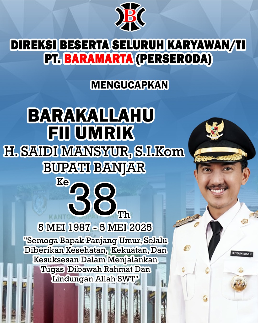 Beranda PT Baramarta Perseroda Selamat Milad ke-38 Tahun Bupati Banjar H Saidi Mansyur 5 Mei 2025 PT Baramarta Perseroda Selamat Milad ke-38 Tahun Bupati Banjar H Saidi Mansyur 5 Mei 2025Katajari.Com10 Mei 202510 Mei 2025 PT Baramarta Perseroda Selamat Milad ke-38 Tahun Bupati Banjar H Saidi Mansyur 5 Mei 2025