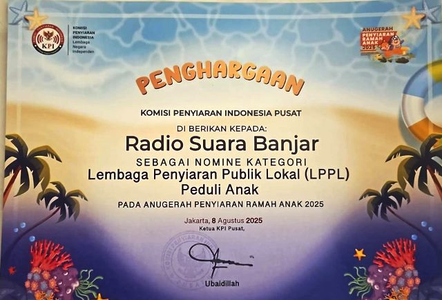 Katajari.com – Lembaga Penyiaran Publik Lokal (LPPL) Radio Suara Banjar berhasil menembus nominasi nasional dalam ajang Anugerah Penyiaran Ramah Anak 2025 yang diselenggarakan Komisi Penyiaran Indonesia (KPI) Pusat.