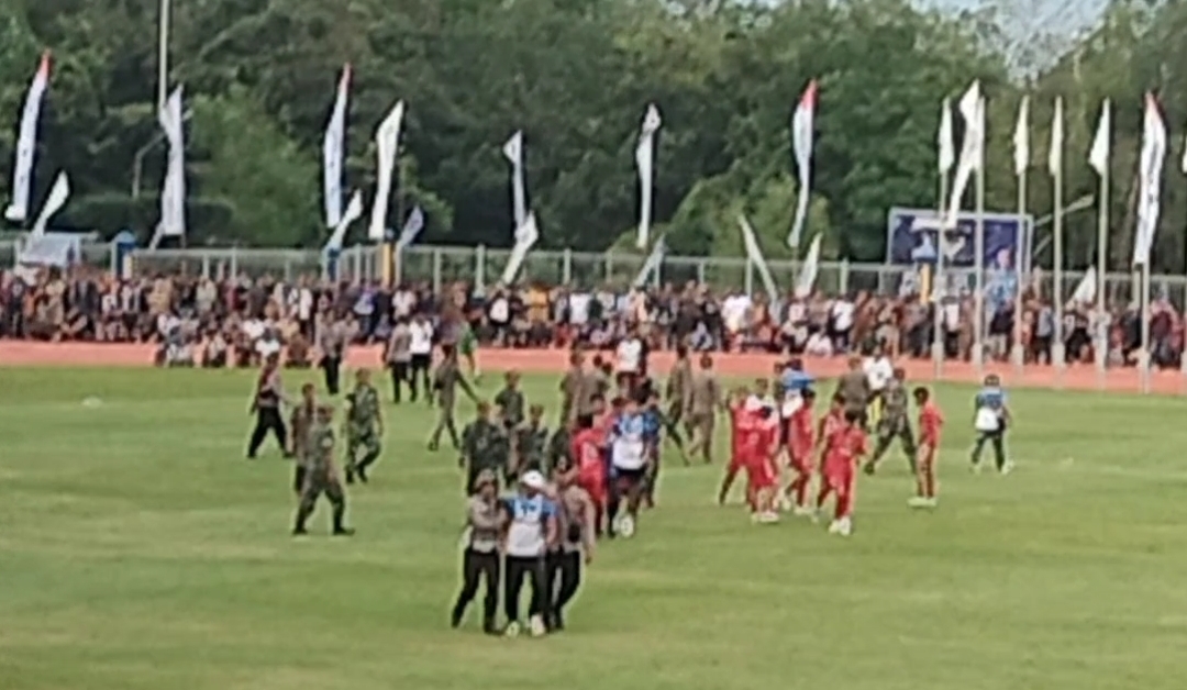 Katajari.com – Pertandingan sepakbola semi final Porprov XII Kalsel 2025 antara tim Kabupaten Banjar melawan Kabupaten Tanah Laut berujung ricuh, Selasa (11/11/2025) sore.
