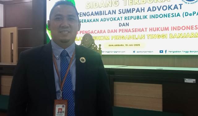 Katajari.com – Tujuh advocat Dewan Pergerakan Advokat Republik Indonesia(DePA-RI) Kalimantan Selatan mengikuti sidang terbuka dengan agenda pengambilan sumpah advokat, Selasa (15/7/2025) di Ruang Sidang Cakra Pengadilan Tinggi Banjarmasin di Kota Banjarbaru.