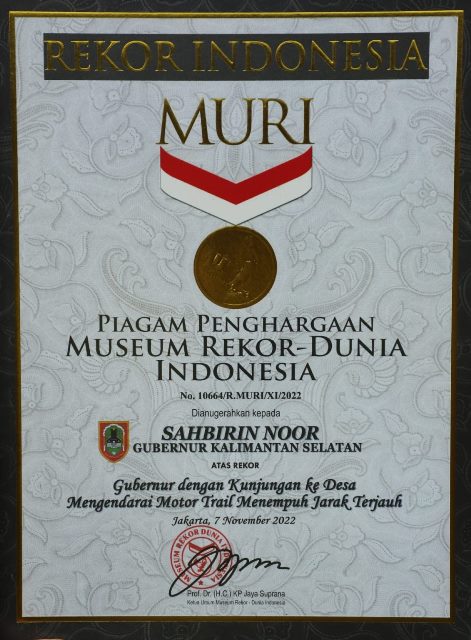 “Hari ini Gubernur Kalsel kita beri rekor MURI setelah mencatat rekor baru sebagai gubernur yang mengunjungi desa menggunakan motor trail dengan jarak terjauh,” ujar Customer Relation Director MURI, Andre Purwandono,SS di Kiram Park, Kabupaten Banjar, Senin (7/11/2022).